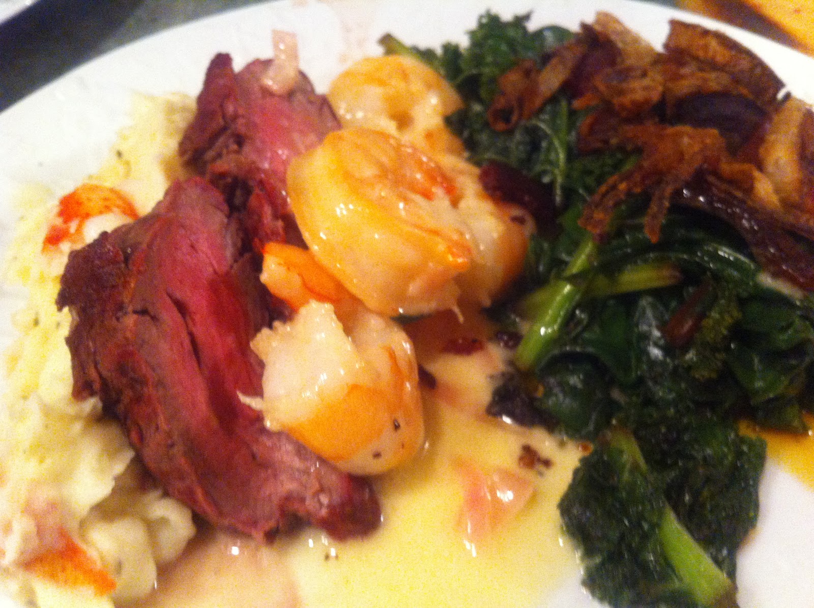 Filet Mignon - Can you ever go wrong? We did filet recently, and we will be shelving it for a while going forward, but is there really any other cut of steak that you could properly use for a Surf and Turf dinner? We grilled a 1.5lb filet roast, and then sliced into medallions after letting it rest for about 5 minutes. We then placed gingerly over those lovely potatoes and topped with the shrimp.